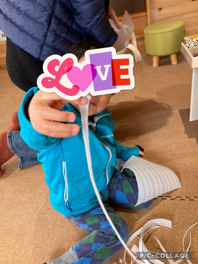 外には本物の雪があるけれどクッション材をびりびりやぶり指先を使い雪遊びのイメージ活動をしました❄️はじめはできなかったけど1人で破れた👦🏻君👏「できた!」の良い顔、いただきました!!✨✨新聞よりふわふわひらひらするのも楽しかった様子💖楽しかった活動は次回もまたやりましょう♪